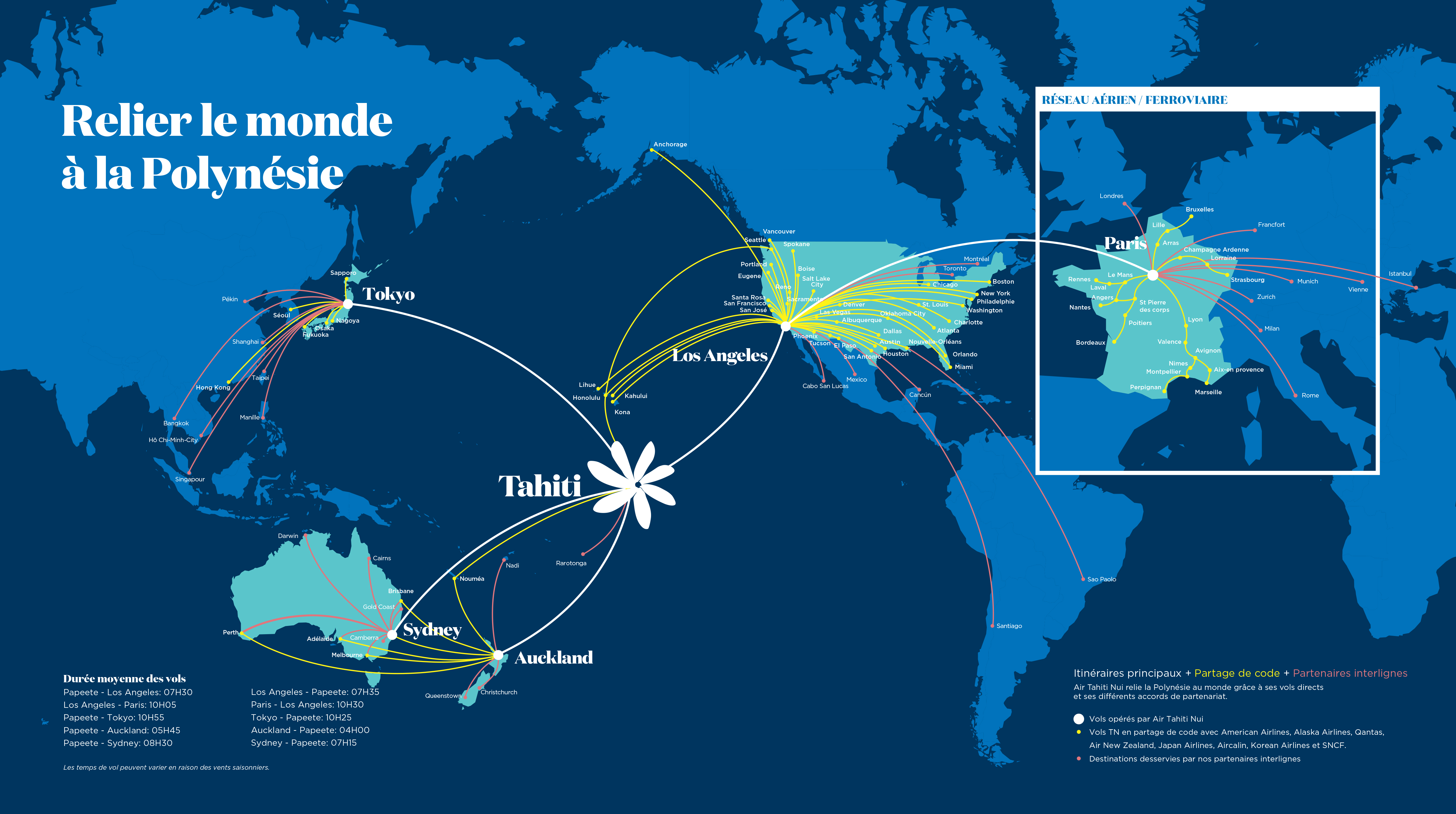 Air Tahiti Nui connects Tahiti to the rest of the world. We offer direct flights between Tahiti and Paris, Los Angeles, Auckland, Sydney and Tokyo aboard our Boeing 787-9 Tahitian Dreamliners